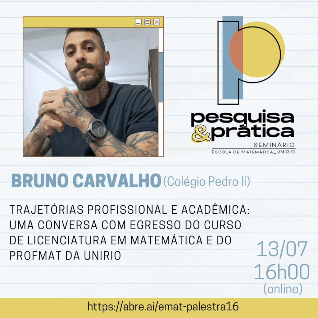 Neste encontro, vamos entrevistar o professor Bruno Braga, professor de matemática do Colégio Pedro II, egresso do PROFMAT e da licenciatura em matemática da UNIRIO. Ele nos contará um pouco da sua trajetória como professor de matemática e compartilhará suas experiências no âmbito acadêmico e profissional. Apesar de ter feito faculdade de economia, sempre atuou como professor de matemática e só 11 anos depois começou a sua formação na matemática. Nesta conversa, ele explica o que me o motivou a fazer essas escolhas, quais dificuldades enfrentou no início da carreira, ainda sem a formação em matemática. Vamos entender como ele construiu a sua identidade docente enquanto cursava a licenciatura, o mestrado e dava aula na educação básica simultaneamente: como essas formações afetaram as suas aulas e como as suas aulas afetaram sua vivência na graduação e na pós-graduação. Por fim, que portas elas lhe abriram até se tornar professor do Colégio Pedro II e colaborador do projeto Livro Aberto de Matemática.
