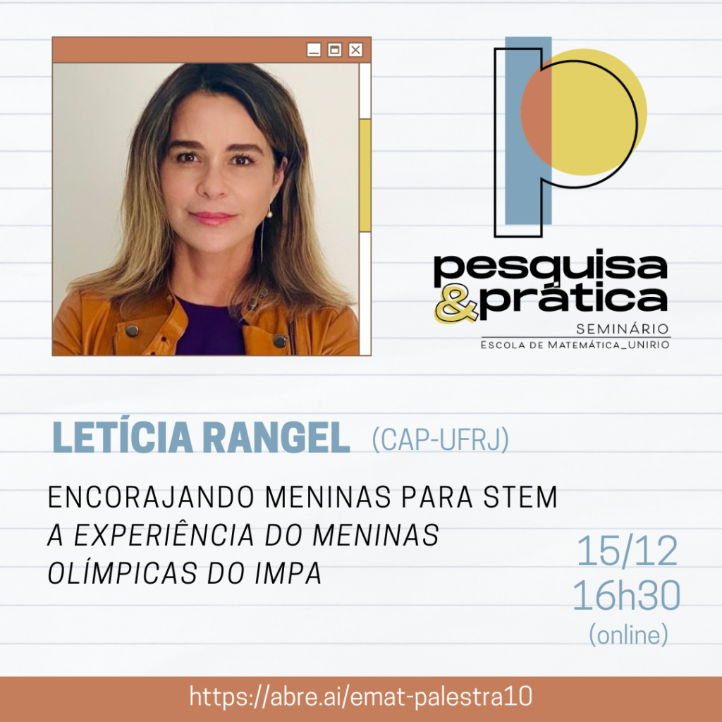 Resumo: Mulheres têm sido minoria nas áreas de ciência, tecnologia, engenharia e matemática (STEM). A falta de representatividade compromete o ingresso, a permanência e o desenvolvimento profissional das mulheres nessas áreas. Esse cenário tem desdobramentos sobre a forma como a ciência e o conhecimento são produzidos. É necessário enfrentar tal segregação e a educação tem assento certo nessa batalha. Práticas de ensino efetivas podem promover a motivação das meninas para STEM, interferindo nos fenômenos de autoeficácia e autosseleção. O projeto Meninas Olímpicas do IMPA tem como objetivo promover o efetivo envolvimento de alunas da Educação Básica em atividades de matemática, computação e robótica, visando a que se interessem e se sintam encorajadas para desenvolver carreiras nas áreas de STEM. Objetiva-se também a formação docente para o enfrentamento da questão de gênero no âmbito escolar a partir de práticas que transponham normas culturais e estereótipos de gênero e que estimulem a igualdade de oportunidades.