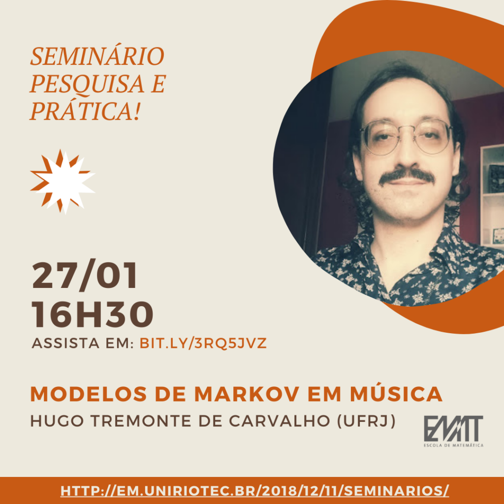 Resumo: A Música é um aspecto cultural de imensa importância, e foi uma das primeiras formas de comunicação utilizada pela humanidade. Sendo a Música um produto de nossa cognição, é esperado que ela carregue consigo certa regularidade, em qualquer gênero ou estilo em questão. Nesta apresentação iremos tratar tal fenômeno de um ponto de vista estatístico, indicando como modelos de Markov podem ser utilizados para descrever e estimar diversos parâmetros musicais, em especial relacionados à melodia e à harmonia.